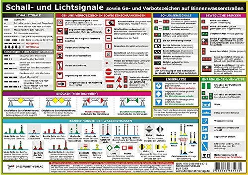 Ob bei guter, schlechter oder gar keiner Sicht auf den Binnenwasserstraßen: verschiedene Fahrzeuge müssen in verschiedenen Situationen unterschiedliche Schallsignale geben und sind verpflichtet, bestimmte Lichter zu führen. Auf dieser Tafel finden Sie die wichtigsten Schall- und Lichtsignale auf einen Blick. Ein unentbehrlicher Helfer bei der Beurteilung einer Vorfahrtsituation! Diese Tafel widersteht auch den rauen Bedingungen im Bordalltag und sollte an keinem Steuerstand fehlen! Ideal auch zur Vorbereitung auf einen der amtlichen Sportboot-Führerscheine (SBF-Binnen bzw. SBF-See).